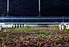 Dette bildet viser hvordan de rundt 20 centimeter høye platene er montert vertikalt for å slippe maksimalt med lys og vann inn til plantene på grønne tak.Foto: Over Easy Solar