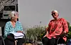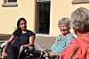 Miriam Mardam (Rødt) i samtale med Randi Svingeseth og Guri Lise Rørvik (med ryggen til) i bakgården på Grünerløkka seniorsenter.Foto: Arnsten Linstad