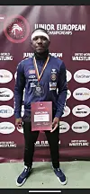 Exauce Mukubu fra Sportsklubben 09 med bronsemedalje og diplom etter bryte-EM for junior i Tyskland.Foto: Privat