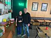 Daglig leder ved Fryd, Fatih Kaya, forteller at skiltet vekker latter både blant gjester og ansatte. Her avbildet sammen med Anna Szweda.Foto: Daniel Kristiansen