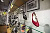 Petter peker på et bilde på disken av han selv og faren, Eugen Larsen. To generasjoner med stolte innehavere av skobutikken.Foto: Olav Helland