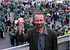 Per Østvold i kjent stil med knyttet neve klar til kamp etter å ha holdt en flammende appell til flere hundre arge streikende transportarbeidere som demonstrerte utenfor Sjølystsenteret hvor Transportbedriftenes Landsforening holdt sin generalforsamling.Arkivfoto: Bjørn Halfdansen / NTB