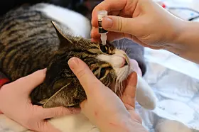 Etter at hannkatten har fått bedøvelse må øynene hvetes med øyedråper. Dette er fordi katten vil ligge med øynene åpne under hele operasjonen.Foto: Petter Terning