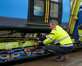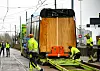 lastebiler. De to delene vinsjes ned på sporet, kobles sammen, og vognen