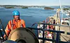 Med Langøyene, Rambergøya ved Gressholmen og Nesodden i bakgrunnen. Oslo Havns tekniske direktør Svein Olav Lunde med de nye kranene klare til å losses i land fra lasteskipet Aal Pusan.Foto: Hans Kristian Riise