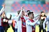 KFUM Oslos Simen Hestnes og resten av spillerene jubler etter at de har slått Brann 1-0 i cupens fjerde runde lørdag.