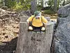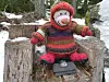 Baloo i sommerutgave, med sekk og en liten cap. Stubben har bymiljøetaten fikset til etter at den forrige sitteplassen falt for vær og vindFoto: Privat