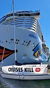 Cruiseskipet AIDAnova er 337 meter langt, 69 meter høyt, veier 87,306 tonn og har 16 dekk.Foto: Extinction Rebellion Norge
