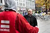 Even Skyrud (t.h.) er mye ute og snakker med magasinselgerne i Erlik Oslo. Bildet er tatt i fjor.Foto: André Kjernsli