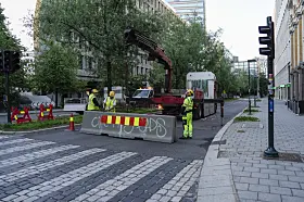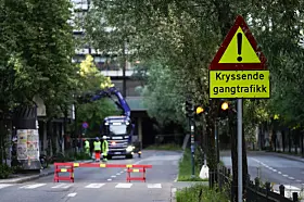 Sperrebukker og anleggsarbeidere på plass i forbindelse med at Hammersborgtunnelen stengte klokken 05.00 mandag 1. juli. Deler av Ring 1 vil være stengt i tre år.
