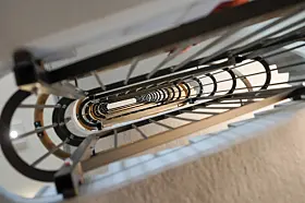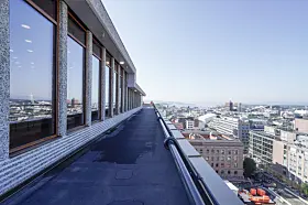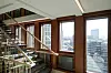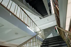 Noen etasjer lenger opp er trappeløpet utsmykket med kunst i naturbetong. Det er hit kunsten av Pablo Picasso og norske kunstnere ble flyttet. Tavlene er utført av Carl Nesjar.