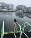 Byråd Sirin Hellvin Stav koser seg i isvannet utenfor Sukkerbiten.Foto: Oslo badstuforening