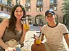 I den store bakgården i gamle Posthallen har serveringsstedet skapt et innbydende og moderne preg, med brostein og frodige trær. Utenfor kafeen nyter Kaitlyn (24) og Joanna (26) fra New York boba i sommervarmen.