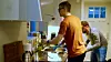 På høyre side langs inngangen til leiligheten er det bygd en fin lang kjøkkenbenk med alle kjøkkenfasiliteter. På andre siden av gangen har paret et kott med oppbevaringsmuligheter og et pent, nyoppusset bad. Gangen munner ut i husets hovedrom, den lille stua hvor Carl og Ryan har en stor TV, et sofabord og to lenestoler.