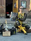– På St. Hansaften stilte jeg opp i trikot og samlet en gruppe venner. Her gir jeg en stein til Daniel Hunn som sitter, som en del av forestillingen foran SKOKS.Foto: Privat
