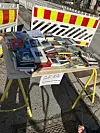 På bordet utenfor hjemmet til Nikolaos Farmakis og familien lå det bøker i alle slag, søndag formiddag. - Ta en bok eller mange, står det skrevet, med oppfordring om å vippse en slant til jordskjelvorfe i Tyrkia og Syria.Foto: Privat