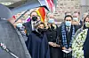 Dronning Sonja, kronprinsesse Mette-Marit, stortingspresident Masud Gharahkhani , høyesterettsjustitiarius Toril Marie Øie utenfor kirken etter bisettelsen av Kim Friele i Oslo domkirke.Foto: Heiko Junge / NTB