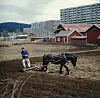 Kommunen lyser ut midler til urbant landbruk. Her en proff bybonde i ferd med å bli tatt igjen av byveksten i 1977. Bildet viser våronna på Ammerud, og pløying med hest.NTB arkivfoto: Erik Thorberg / NTB