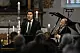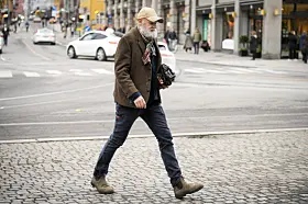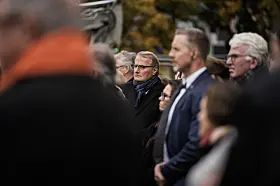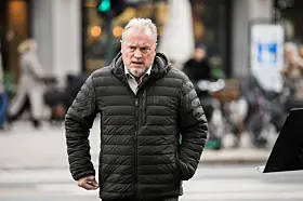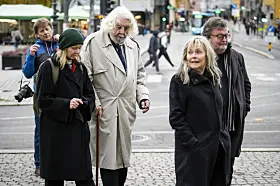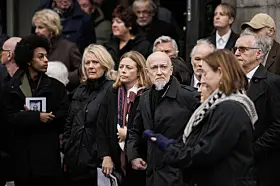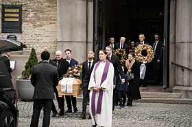 Forfatter Lars Saabye Christensen utenfor domkirken mens kisten bæres ut.Foto: Stian Lysberg Solum / NTB