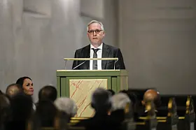 Forfatter Lars Saabye Christensen holdt minneord under gravferdsseremonien for Roy Jacobsen i Oslo domkirke.Foto: Stian Lysberg Solum / NTB
