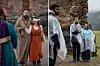 Før og etter: Moderne regntøy er byttet ut med tidsriktige kostymer. Foto: Olav Helland