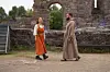 Det første publikum møter er to jenter som ønsker velkommen til året 1349.Foto: Olav Helland