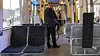 En fremtidig passasjer gransker den nye trikken innvendig. Foto: Thor Langfeldt