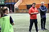 Her slår den nye treneren Jack Majgaard Jensen av noen ord med landsmanninne og midtstopper Stine Ballisager Pedesen, mens resten av laget holder formen ved like. Foto: Christian Boger