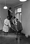Dette bildet er datert 18. juli 1971, og viser arbeidsinnvandrere fra Pakistan som har hatt midlertidig bosted på Møllergata skole. På bildet er noen av dem kommet til den gamle gardekassernen i Kirkeveien 23 hvor de de maler og vasker et rom før innflytting. Foto: NTB