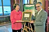 En stolt ordfører Marianne Borgen og frimerkedirektør i posten, Halvor Fasting, med førstedagsbrevet for det nye frimerket. Foto: Christian Boger