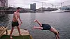 Plutselig braser det i vannflaten, og tre isbadere er på vei fra saunaen og rett ut i et havnebasseng med en temperatur såvidt over frysepunktet. Latter og skrik fyller overflaten, men det går ikke lenge før de modige sjelene igjen er på land og setter kursen for badstuas seksti varmende grader.