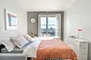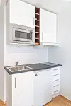 Den lille leiligheten på 14 kvadrat inneholder bad, kjøkkenkrok og oppholdsrom. I tillegg medfølger en kjellerbod på omtrent 2,5 kvadratmeter, og tilgang til en felles takterrasse og fransk balkong.