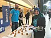 Bernhard Probst og Sakina Benmalek serverer boller, kaffe og byguide til menneskene som går gjennom Østbanehallen på Oslo S. Foto: Vegard Velle