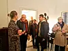 Barn og barnebarn Kolstad i aktiv prat med nåværende beboer i leiligheten Christine Dickens. Foto: Emilie Pascale Bloin Helgheim