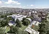 Illustrasjon som viser hvordan Marienlyst i Oslo kan se ut, etter at NRK flytter ut fra området. Kringkastingshuset med Store Studio midt i bildet. Foto: A-LAB / NRK / NTB scanpix