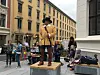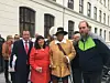 Åpning av Cort Adelers plass med flere inviterte talere. Fra venstre: Ordfører i Porsgrunn Robin Kåss, leder i byutviklingskomiteen Victoria Evensen, Arne Rønningen utkledd som Cort Adeler og initiativtaker Geir Rognlien Elgvin. Foto: Live Drønen