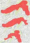 Disse tre kartutsnittene viser fra topp til bunn utviklingen i hvordan kokeanbefalingen har berørt husstandene på Midtstuen i ulike faser, med det første øverst, det noe innskrenkede første varselet i midten og det siste nederst. Merk at kartutsnittene ikke er gjengitt etter samme målestokk.Kart: Vann- og avløpsetaten