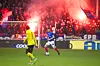 Ikke overraskende var det blussing før kamp både blant Kanarifansen og de tilreisende supporterne til Vålerenga. Et av blussene ble kastet ut på banen, og kampen måtte stoppes før minuttet hadde gått.