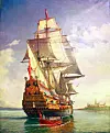 Orlogsskipet Sophia Amalia ble bygget og sjøsatt på Hovedøya i 1650, og var et av samtidens kraftigste krigsskip. De rike utskjæringsarbeidene ble dekorert av malermester Villum Hornboldt fra København. Maleri: Av Paul Sinding/eier Marinemuseet Horten