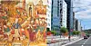Fra middelalderdronning til hovedgate i Barcode. (Illustrasjonsbilde, til venstre: Byggeplass under høymiddelalderen, Foto: Wikipedia. Til høyre: Dronning eufemias gate. Foto: Helge Høifødt/Wikipedia)