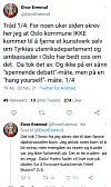 «For noen uker siden skrev jeg her at Oslo kommune IKKE kommer til å fjerne et kunstverk selv om Tyrkias utenriksdepartement og ambassadør i Oslo har bedt oss om det. Da tok det av. Og ikke på en sånn "spennende debatt"-måte, men på en "hang yourself"-måte», skriver Evenrud.