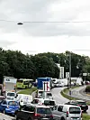 Skiltet omkjøring via sentrum Når påkjøringstunnelen er stengt, er det skiltet omkjøring.