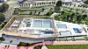 Nye Tøyenbadet skal bygges på samme sted som det gamle ligger i dag. Synstolkning: Bildet viser tegning av nye Tøyenbadet sett ovenfra med fire bassenger innendørs og fire bassenger utendørs. Illustrasjon: Asplan Viak/ Oslo kommune
