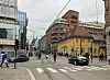 Dett er et trafikkert område, med trikker, mange gående og en del biler.