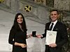 Nina Solli, leder i Yrkesopplæringsnemnda i Oslo, deler ut fagprøvemedaljen for særdeles godt arbeid til Hans Vegar Danielsen. Foto: Ole Kristian Grønneng / Utdanningsetaten