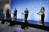 Helsedirektør Bjørn Guldvog, helse- og omsorgsminister Bent Høie (H), statsminister Erna Solberg (H), og direktør ved Folkehelseinstituttet, Camilla Stoltenberg la frem noen lettelser for barn og unge på pressekonferanse i dag.Foto: Lise Åserud / NTB