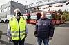 Forbundsleder Jørn Eggum og streikende bussarbeidere og tillitsvalgt Annstein Garnes (til venstre).