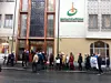 Tidligere sto det en lang kø bortover gata her, men den er borte nå. Nå er køen inne i kirken i stedet. Menneskene i køen kan nå vente inne i varmen.