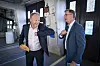 Korona-hilsen mellom de to nære vennene og byrådskollegene. Byrådsleder Raymond Johansen (Ap) og helsebyråd Robert Steen (Ap) fotografert før en pressekonferanse under pandemien.Foto: Heiko Junge / NTB