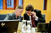 Styreleder Morten Malmin (til venstre) i Folkeaksjonen Nei til mer bompenger (FNB) sammen med advokat John Christian Elden i Oslo byfogdembete. Foto: Vidar Ruud / NTB scanpix